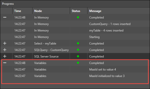 After the data flow and/ or data model has been run, you can access the ETL's Progress panel from the job spooler, and see the status of the variables: