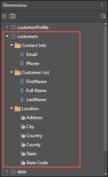 This grouping helps users to easily find the required hierarchies from the Dimensions panel when building data discoveries (red highlight below):
