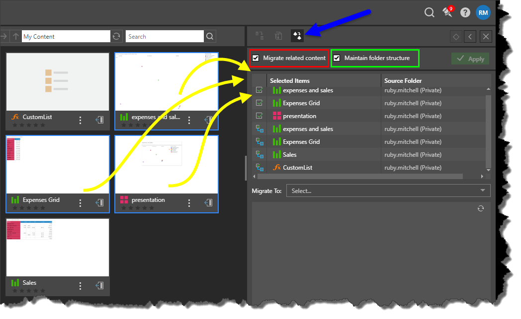 If you are migrating a folder or a selection of items that contain folders, you can enable the 'Maintain folder structure' option (green highlight above) to maintain the structure of sub-folders within the selected folder on the target instance.