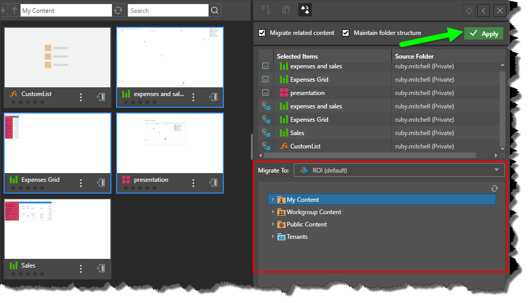Once you've selected the destination instance, the content folder tree on that instance will appear (red highlight below). Find and select the folder location to which you want to migrate your content items, then click the green Apply button.
