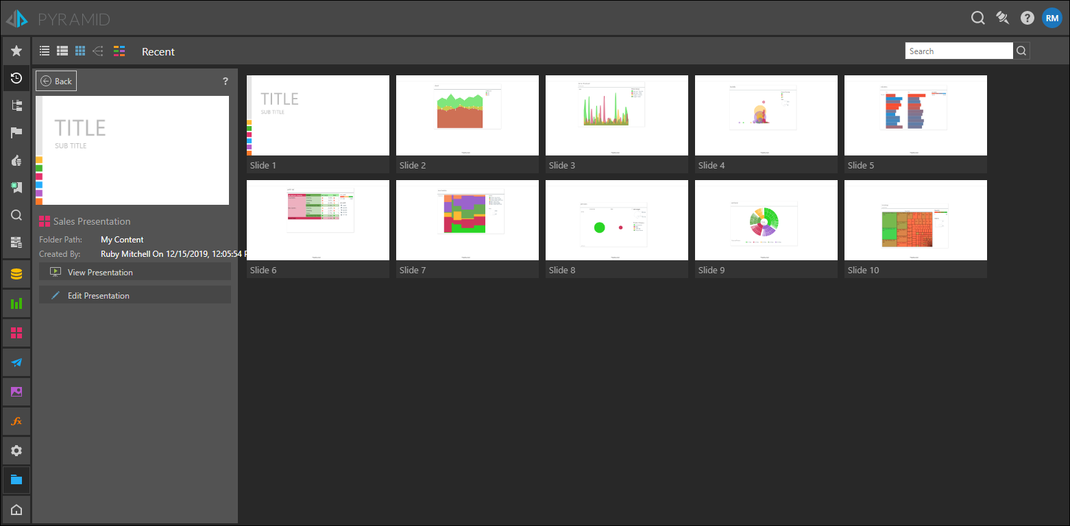 When opening Present content from the content manager, the default action is to open the presentation in 'runtime' - which effectively opens the dashboard content in "show mode" for immediate viewing and consumption, rather than editing. The "view" function can be modulated to either open the presentation directly on the first slide or let the user see all the slides first and allow them to pick their own starting point using the 'Presentation Launcher'.