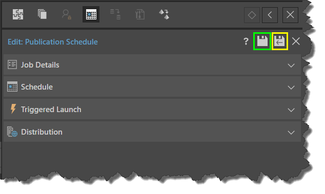 - Save: click the Save icon (green highlight below) to save changes to the schedule without running it.