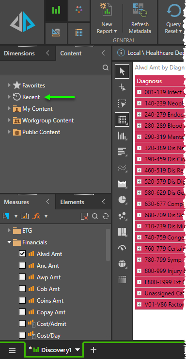 "Recents" is a FLAT listing of all recently used content items by the current user - providing a convenient mechanism for users to quickly find the latest items they used. Recent content can be accessed from the Home Dashboard as well as many other locations through the application where content is accessed.