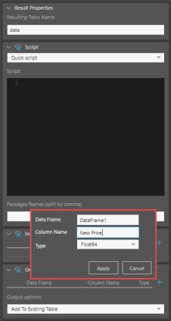 The Regular Script function allows you to inject scripts into a table, during the ETL. The results will then be added to the selected table as an additional column, or you can use your script to create a new table.