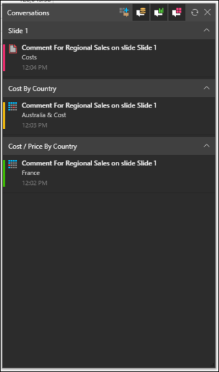 in a visual's panels to show or hide that visual's conversations. Right click on a cell to start a conversation or open an existing one. - Right click on the report slide and select Show Conversations open the Conversations panel
