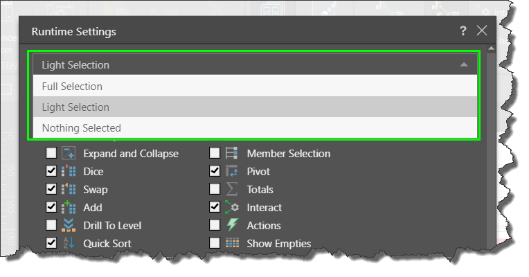 - Light Selection: enables only drill, dice, quick sort, quick filter, pivot, and conversations; you can manually disable any of these or enable additional functions.