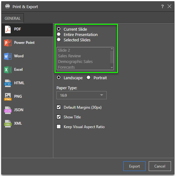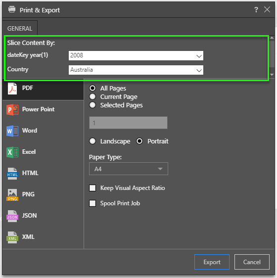 • Output Type: PDF, PowerPoint, Word, Excel, HTML, PNG, Comma Delimited text(CSV), JSON text, XML text