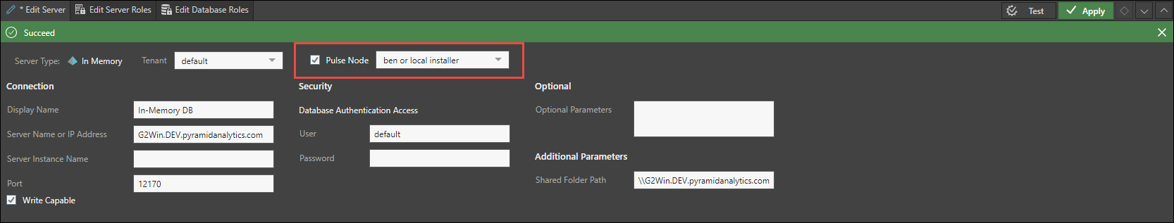 Click Apply to connect the pulse node to the server.