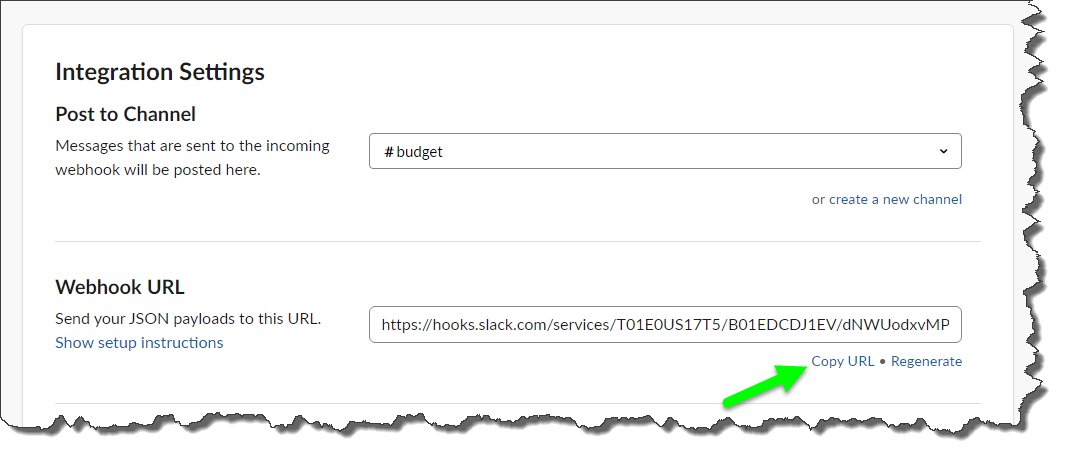 Scroll down to 'Integration Settings'. From the 'Webhook URL' field click 'Copy URL'.