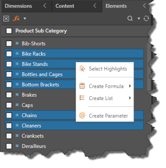 In the example below, the highlighted elements from the Product Sub Category hierarchy are going to be selected: