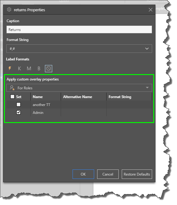 After editing the caption, format string, and/ or label formats, select 'For Roles' from the drop-down to expose a list of roles. Select the roles you want to assign to the overlay and click OK.
