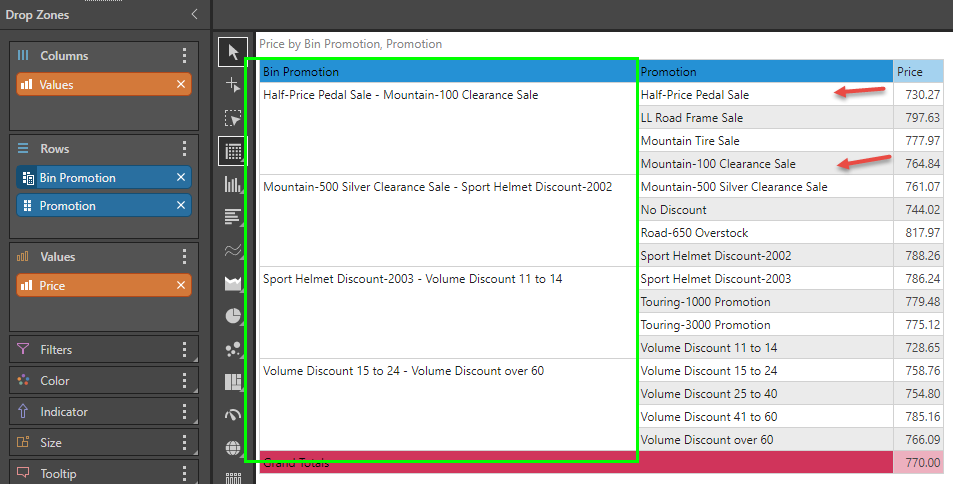 Notice that the bin names are auto generated from the highest and lowest values in each bin. Also, each band has the same number of promotional items (4 items each).