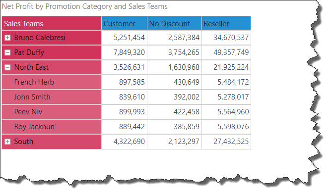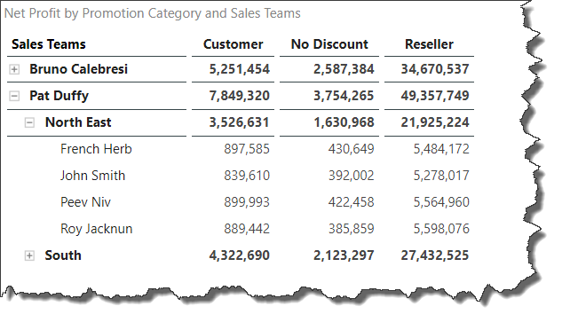 If the grid contains a regular hierarchy on rows, the member captions for the expanded levels of the hierarchy are indented: