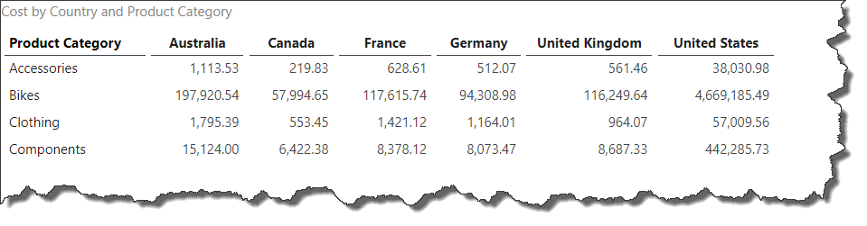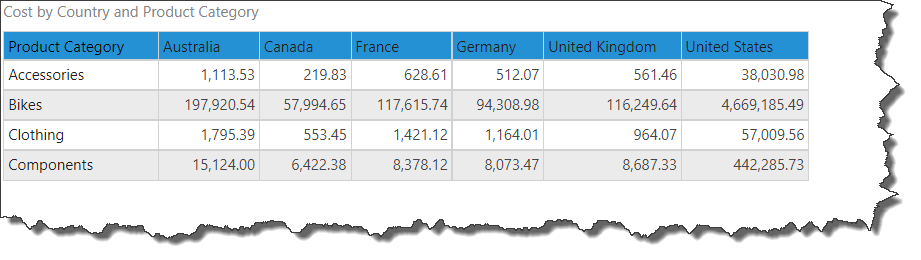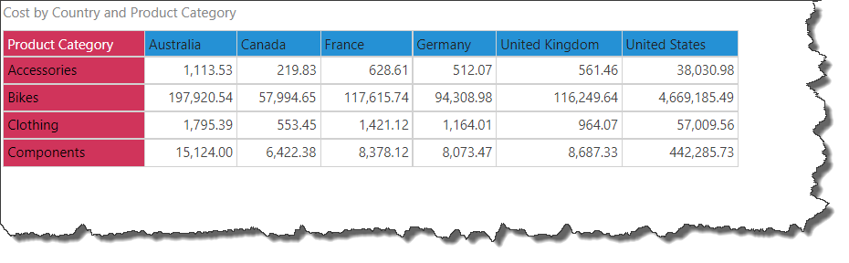 The accounting mode removes the grid, column, and row borders. The column headers are displayed in bold underlined font. The row headers are not emphasized if an attribute hierarchy was added to rows: