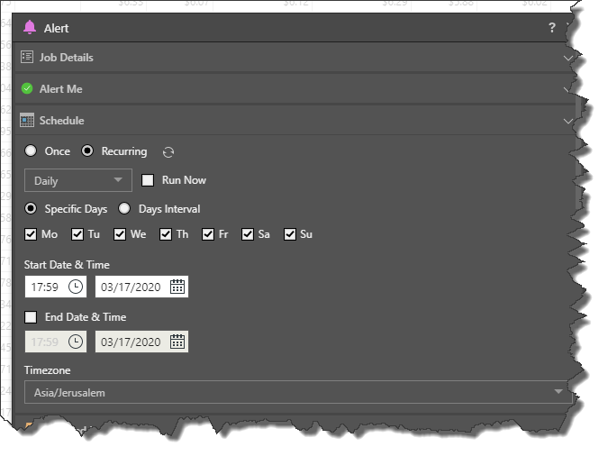 Choose this option to run the alert job on a recurring basis, wither hourly, daily, weekly, or monthly.