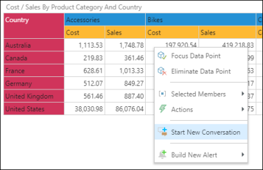 To comment on a data point, start a cell level conversation. This allows you comment on a specific data point in the query, such as Australia & Bikes & Cost. To do this, right click on the required cell in the query, and select Start New Conversation from the context menu.