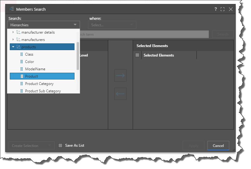Open the Members Search wizard, and from the Hierarchies drop-down under Search, open the Products dimension and select the Product hierarchy.