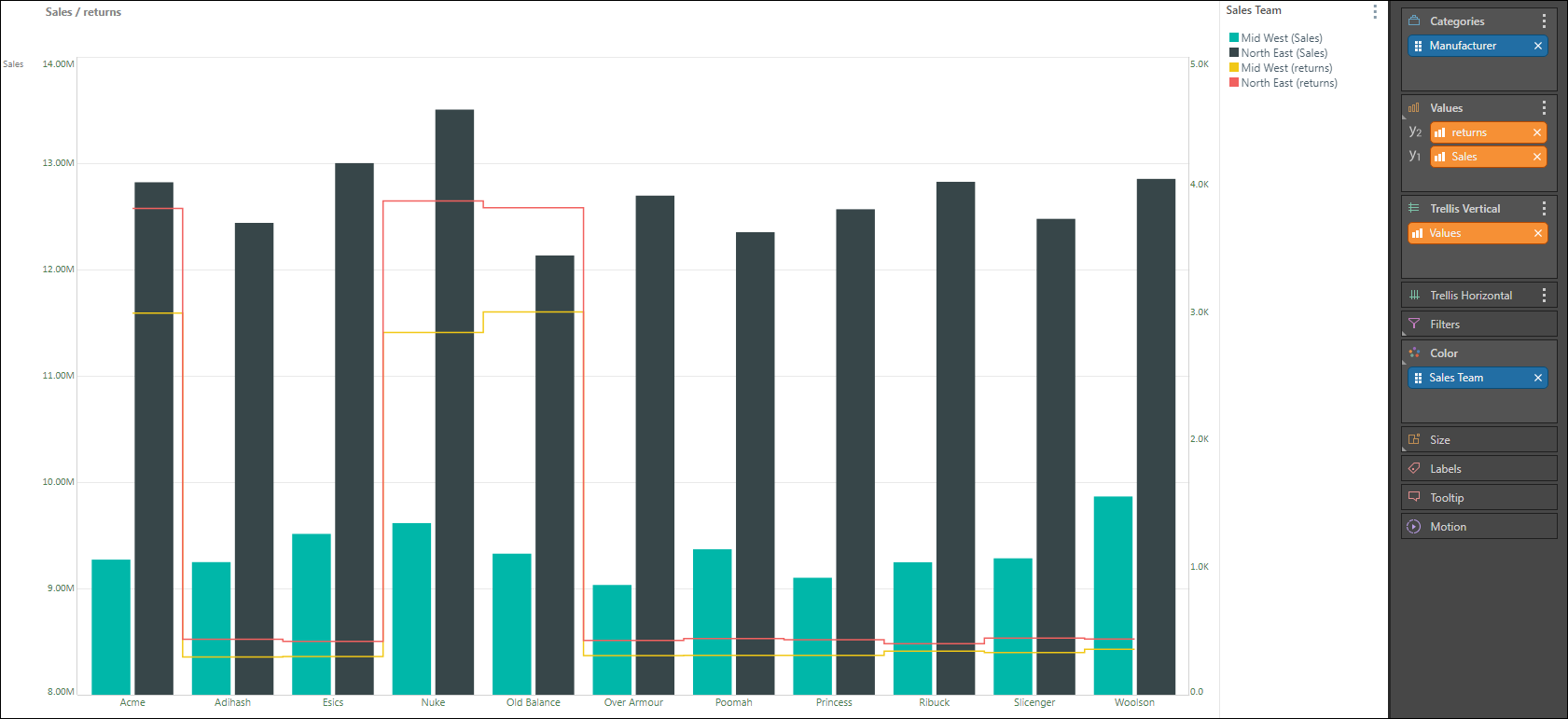 In this example, the Sales measure was added to the 'All' column, converting all of the trellised charts into combo charts: