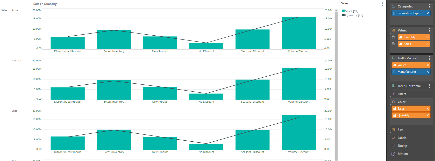 The charts can also be trellised by adding a second member hierarchy to a trellis zone, to create multi-combo charts, for example, Sales and Net Profit by Promotion Type, for each Manufacturer.