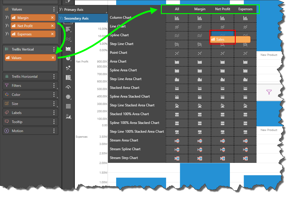 In the example below, the chart is trellised by 3 measures: Margin, Net Profit, and Expenses. A fourth measure, Sales, as added to the Secondary Axis. It is added to the Spline Chart visual for the Net Profit column (red highlight):
