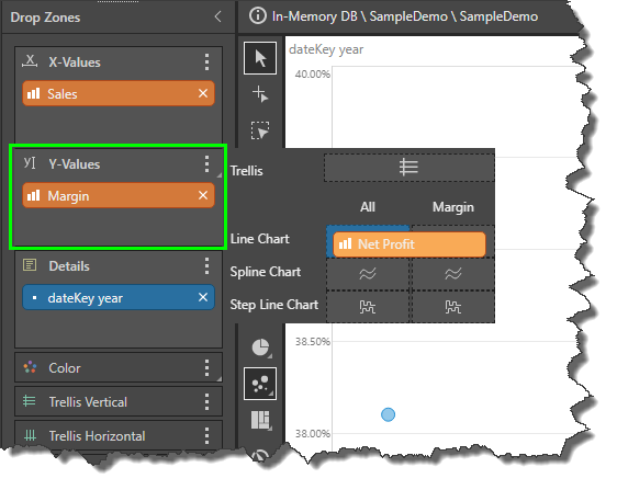 - Drag the measure over the required axis option, and in the next pop-out menu, drop the measure onto zone representing the required chart type and axis (see 'Multiple Values for Trellised Charts' below).