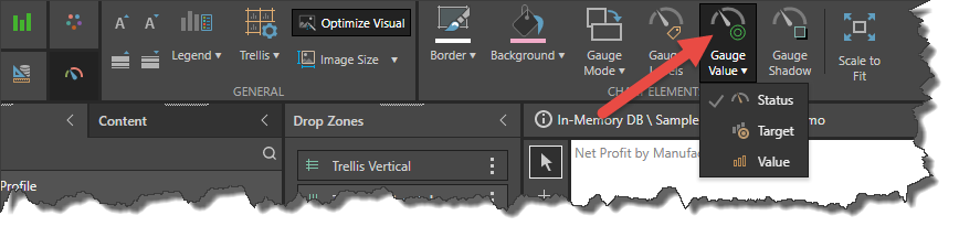 By default, the KPI value displayed in the center of the gauge is the Status; you can change this from the Gauge Value drop down and display the measure from the Target or Value drop zone instead. Open the Gauge Value drop-down from the Component ribbon and choose which value should be set as the gauge value.