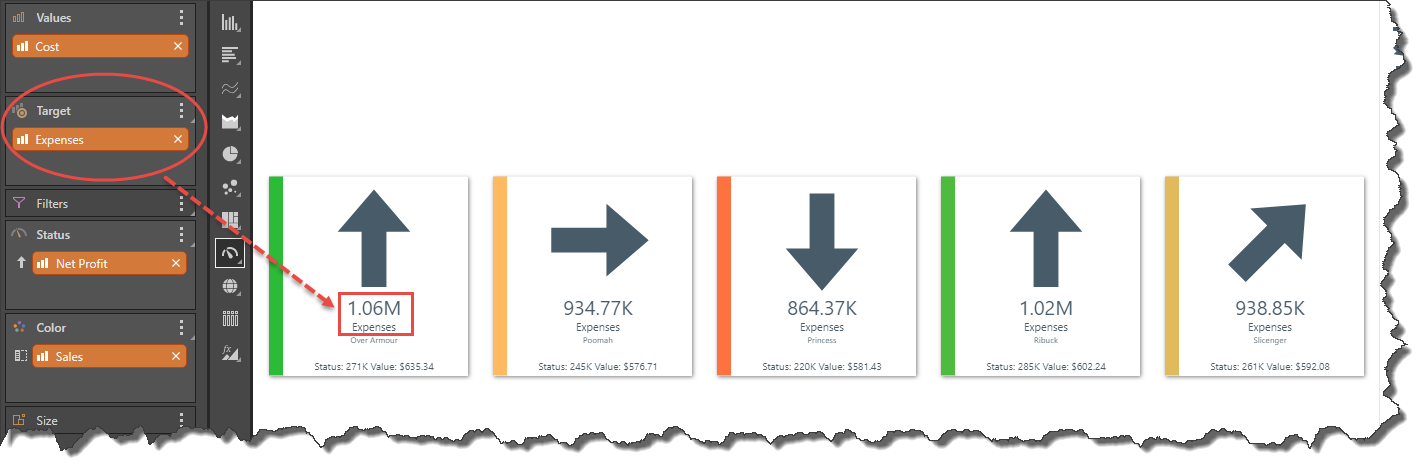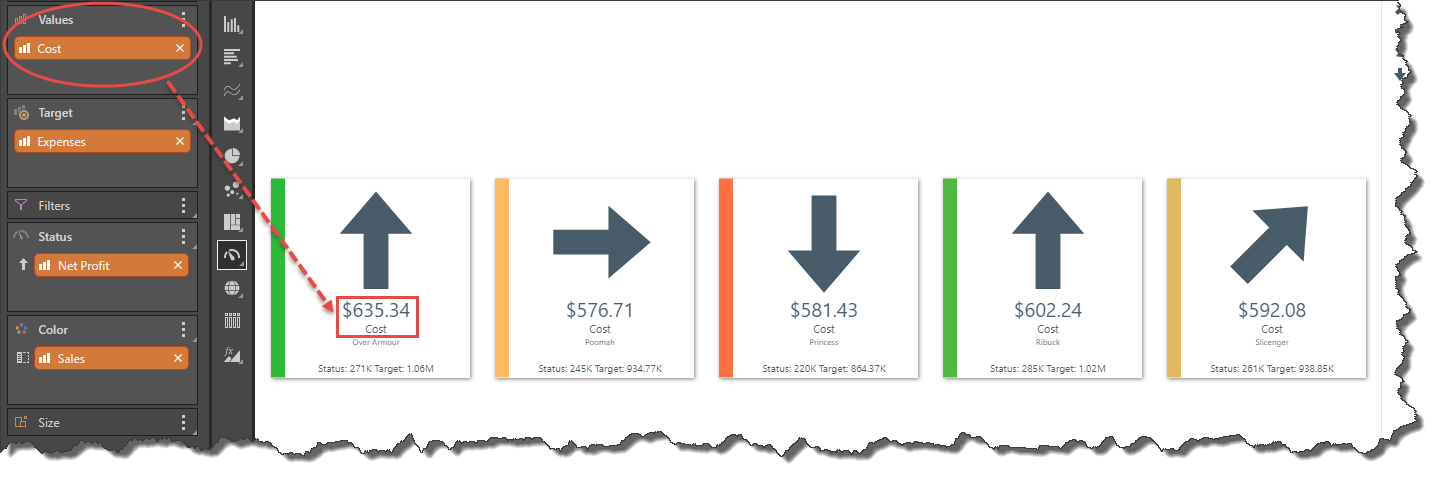 Here, the Status was set as the gauge value; the Net Profit measure is in the Status drop zone, so each gauge displays the net profit for its data point, and the label "Net Profit".