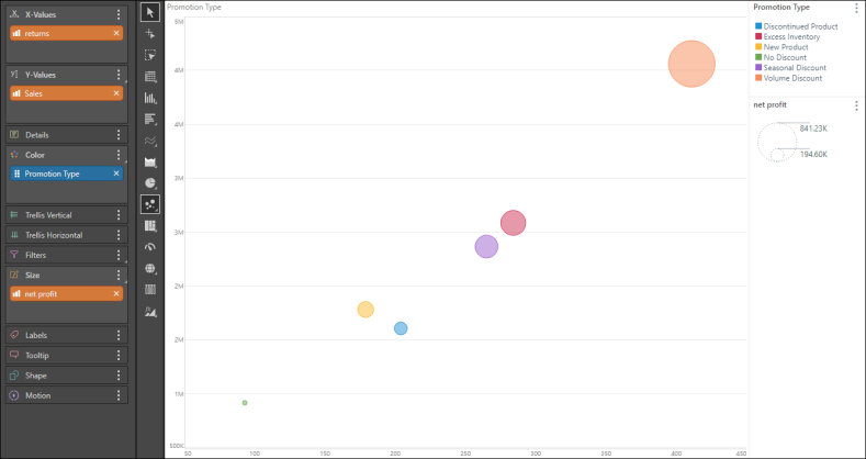 Use plotted charts to plot multiple measures in relation to a single member hierarchy, in order to determine a positive or negative correlation between the measures in relation to the hierarchy. Plotted charts require a measure in the X-Values drop zone, a second measure in Y-Values, and a member hierarchy on Color. A third measure may be added to Size.
