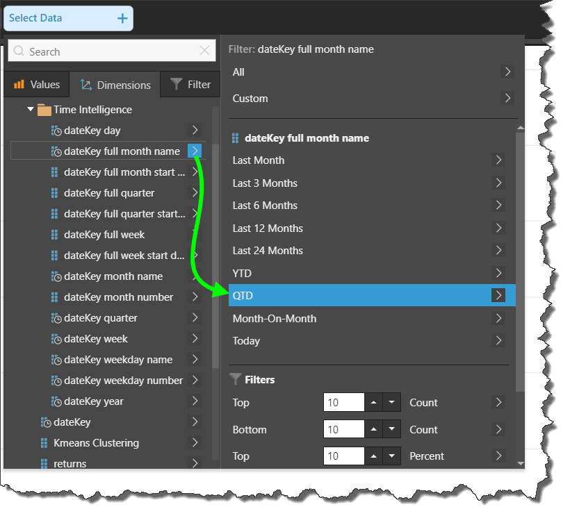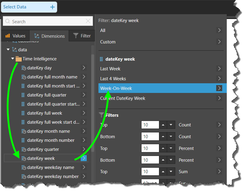 The calculations that are exposed depend on the type of date/ time hierarchy that you select. If you select a dateKey hierarchy, the calculations will be based on days. However, a number of Time Intelligence columns support calculations for other date/ time groupings. If you select the 'full month name' time intelligence hierarchy, the calculations will based on months. Alternatively, select the 'week' hierarchy to choose week-based calculations, the 'quarter' hierarchy to choose quarter-based calculations, or the 'year' hierarchy to choose year-based calculations.