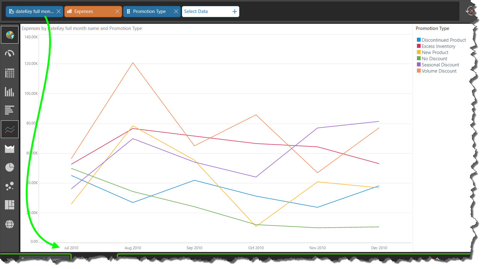 You can add a date-time calculation as a hierarchy selection, or as a filter selection. The former option allows you to add the date-time calculation to the visualization as any other hierarchy. This is useful if, for instance, you want your visual to display a trend over time. For example, the visual below displays expenses for promotions; adding the full month calculation as a hierarchy added the months to the y-axis, so the visual displays a monthly trend: