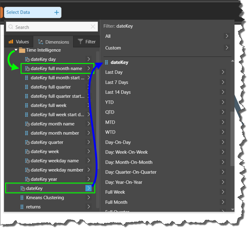 Date-Time calculations are used to add date-time groupings to the visual if the data model being queried does not already contain the needed groupings. In this case, the user can open the sub-menu of the dateKey hierarchy (or a number of other date-time hierarchies), where they can select the required calculation.