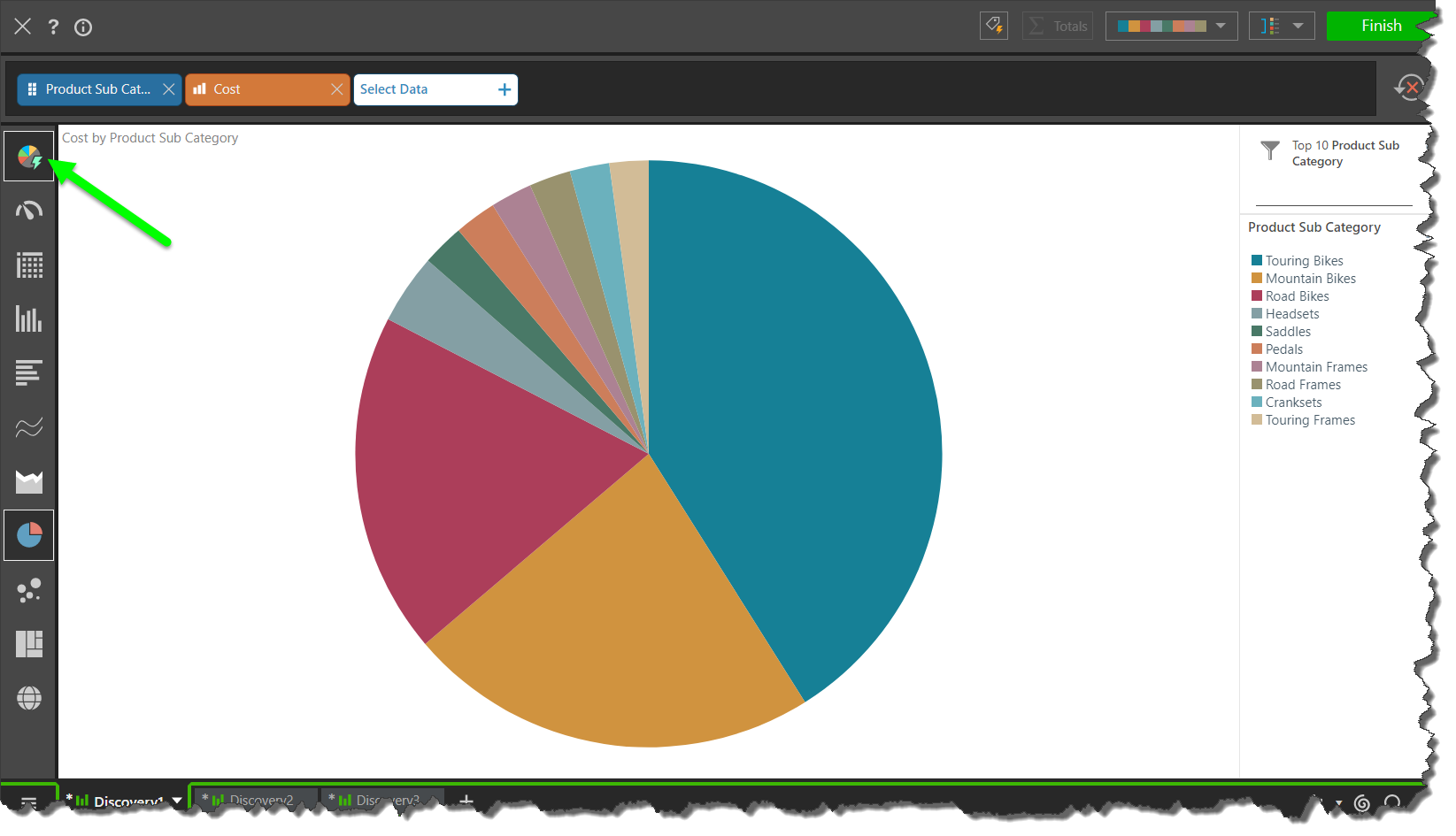 The Auto Recommend (green arrow below) button is located at the top of the Visualization Picker, and is enabled by default. When enabled, Pyramid uses AI driven Smart Visualization engine to automatically select and draw a visual for the data you have selected. In this example, the data was displayed as a pie chart: