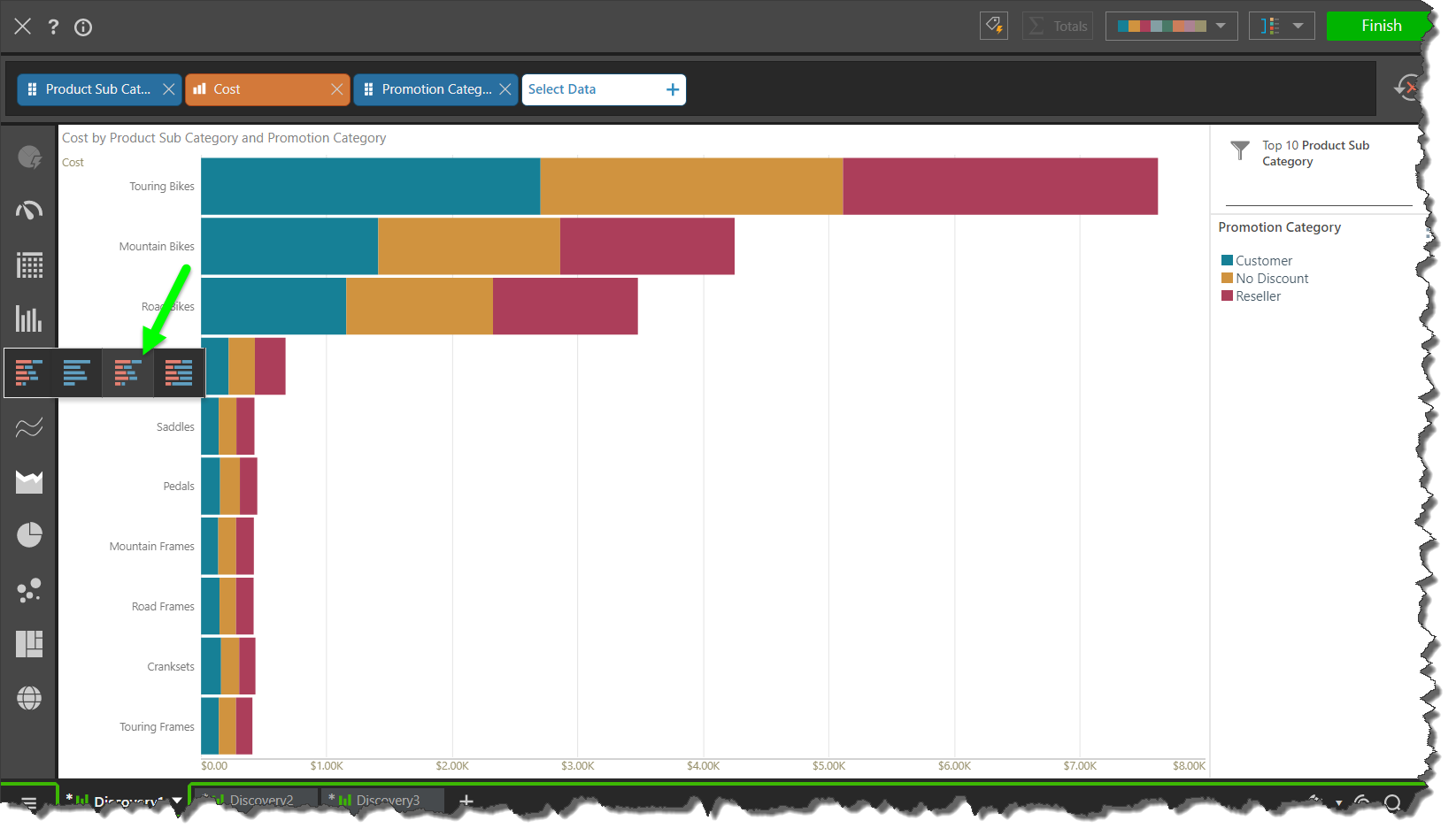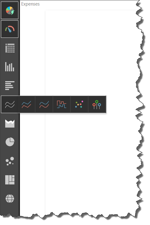 The Visualization "Smart" Picker is located along the left-hand side of the workspace. It features dozens of visualizations, offering users tremendous flexibility in the visualization of their data. By default - the visualizations are drawn using the AI engine that plots the data using the most appropriate visual with the most appropriate data layout given the user's selections. The base visual can, however, be overridden by the user with manual selections from the visualization picker.