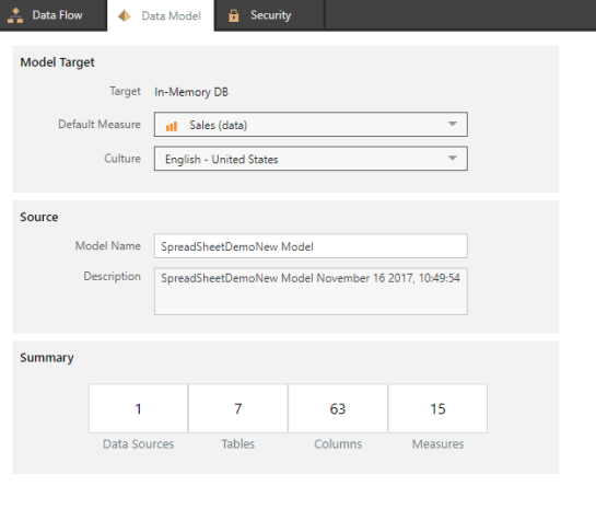 The summary displays some statistics about the data model. It displays the number of data sources used to create the data model, and the number of tables, columns, and measures in the data model.