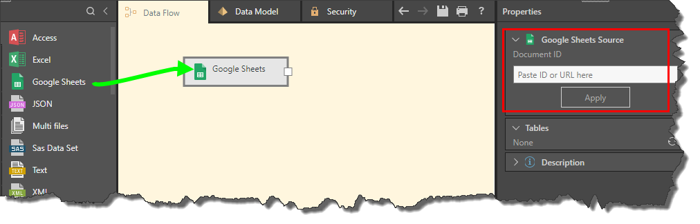 To connect to a Google Sheet, and the Google Sheets node to the data flow and then enter the relevant ID or URL in the Document ID field of the Properties panel (red highlight below).
