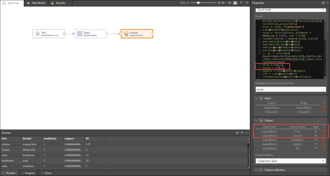 In this example, we see estimates of various product pairings for a grocery store. Input two columns: the transaction number, and the product name. Ensure that the first line of the script matches the input.