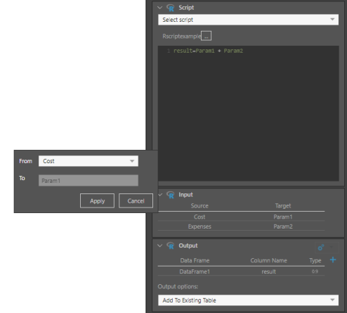 Click the plus sign under input. In From, select the column you want to apply the script to. From To, enter the name that will be used in the script, and click Apply.