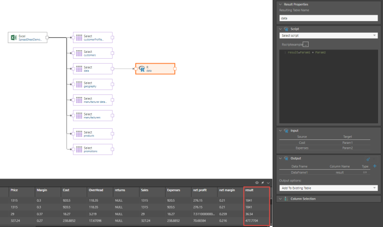 The Regular Script function allows you to inject scripts into a table, during the ETL. The results will then be added to the selected table as an additional column, or you can use your script to create a new table.