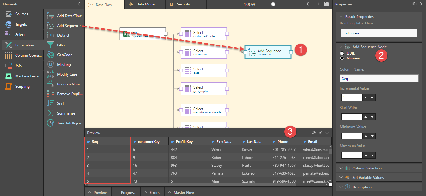 3. Preview the Add Sequence node to see the table with the sequence column.
