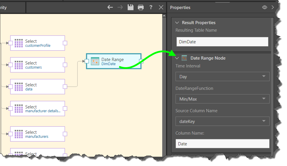 Add the Date Range node to the table where you want to generate the dates hierarchy. With the node selected, go to its Properties panel to configure it (green arrow below).