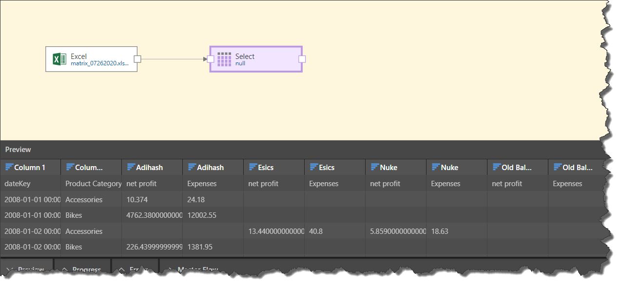 In this example, we have 2 columns consisting of row headers, which we want to convert into columns: dateKey and Product Category. These are the 2 left-most columns which are selected and shaded in blue in the image below.