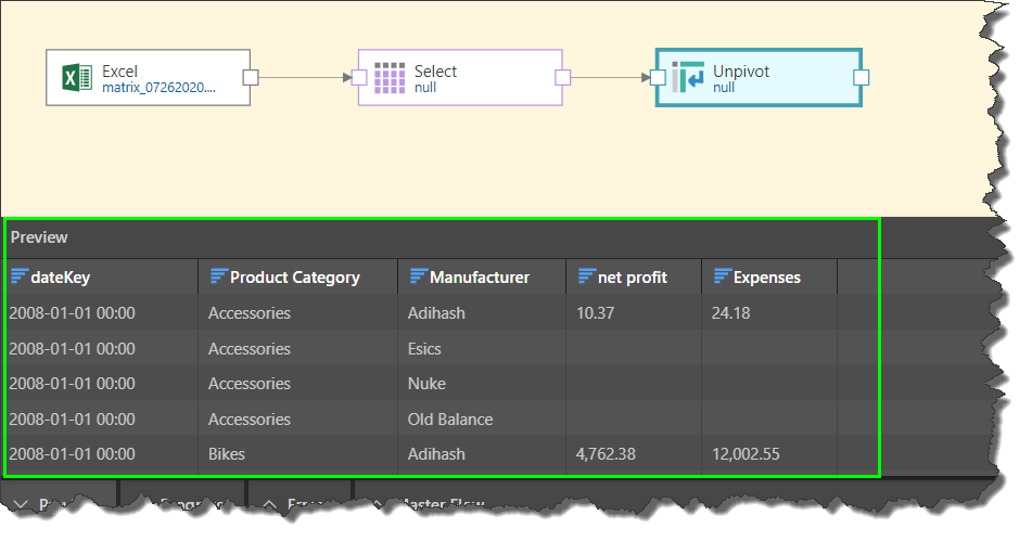 After clicking Apply, we can see the flattened columns when previewing the Unpivot node: