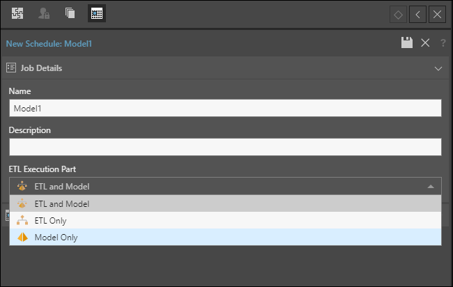 In Job Details, add a name and description for the job, and choose if both the ETL and the Model should be executed, or only the ETL, or only the Model: