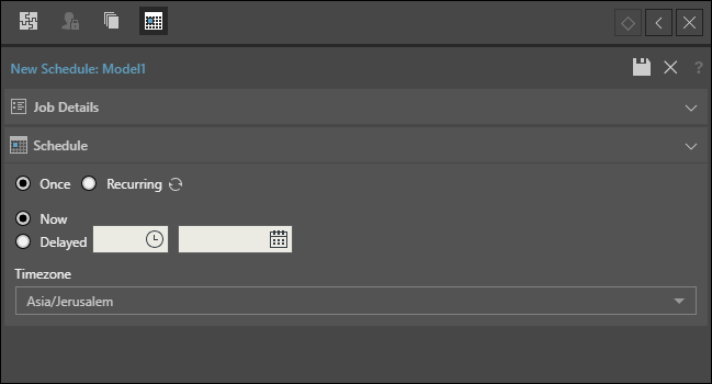Under Schedule, select if the scheduling job should run once, or on a recurring basis. If you select Once, then select when you want the job to run - either immediately, or at a specified time and date. Lastly, set the time zone.