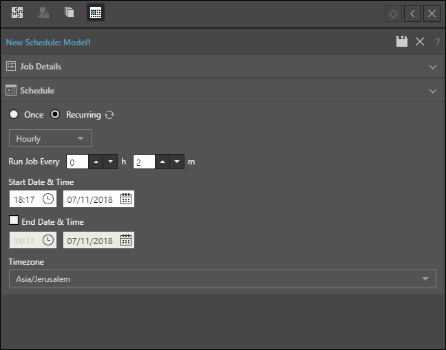 If you choose a recurring schedule, then select the frequency of the job (hourly, daily, weekly, or monthly). Next, enter the start date and time (you can also enter an end date and time if relevant).