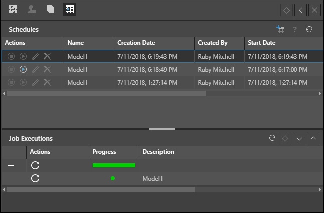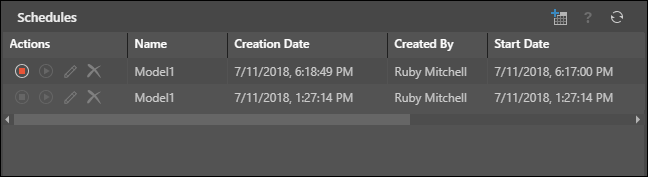 To edit a scheduled job, open the Schedules panel from the model's Actions Panel in the Content Explorer, and under actions select Stop, Start, Edit, or Delete.