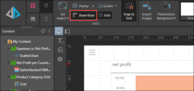 Use the Show Ruler button to show or hide the ruler along the top and left side of the canvas. This button is only enabled when working with a fixed layout.