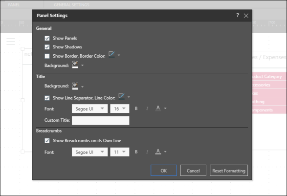 Enabling the Show Panel function also enables Title and Breadcrumbs by default. These can be disabled by click the relevant button.