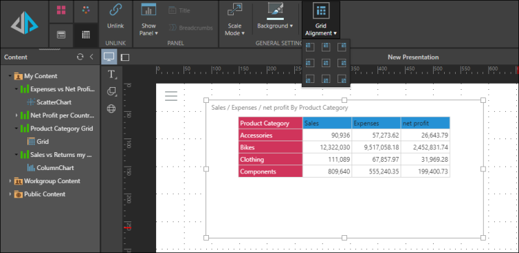 When working with grids, open the Grid Alignment menu to align the grid within the visualization.