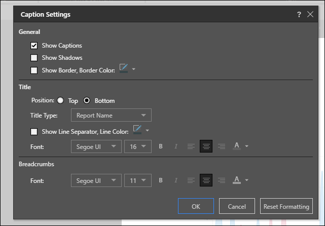 Show Line Separator, Line Color: show or hide a line separator between the caption and the visual. Choose a color.